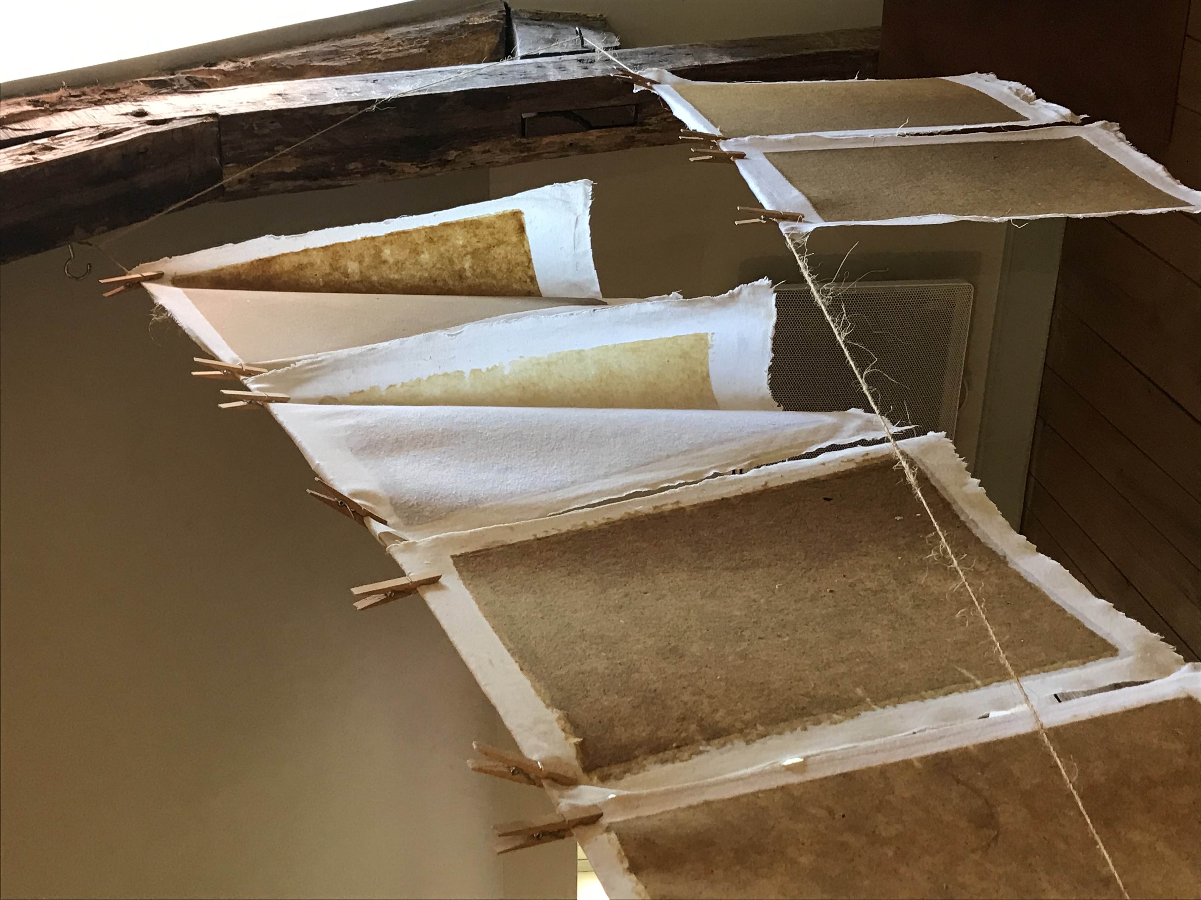 Résidence à Payzac, France. Fabrication artisanale de papiers à partir d’une pâte de paille de seigle, avec l’aide de Laurence, papetière de l’association la Forme Ronde. Les qualités naturelles de la paille de seigle permet de rendre le papier étanche, teinté sans colorant.